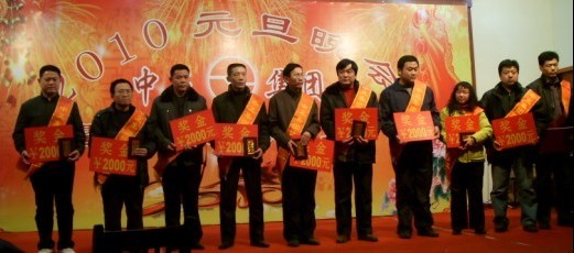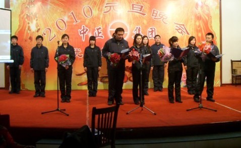 本次年會共分為三部分。第一部分是2009年總結(jié)會,于上午成功召開;第二部分是2009年優(yōu)秀員工頒獎大會,于下午三點(diǎn)隆重舉行,來自集團(tuán)及分公司的十二位優(yōu)秀員工受到表彰;第三部分是2010年元旦晚會,于下午四點(diǎn)開始,在一派喜氣洋洋中,應(yīng)邀嘉賓、集團(tuán)及各分公司領(lǐng)導(dǎo)、集團(tuán)及各分公司員工、員工家屬等共計(jì)200余人一起度過了美好而難忘的快樂時(shí)光。